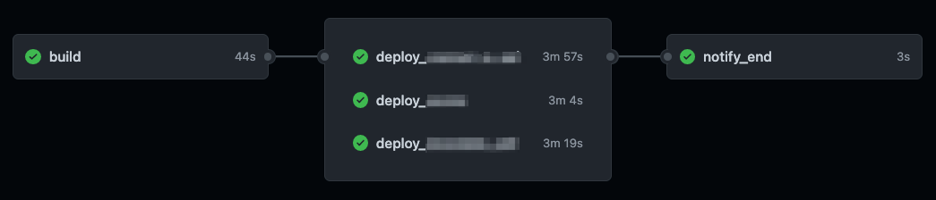 deploy_1: needs: build runs-on: ubuntu-latest steps: # デプロイ deploy_2: needs: build runs-on: ubuntu-latest steps: # デプロイ deploy_3: needs: build runs-on: ubuntu-latest steps: # デプロイ