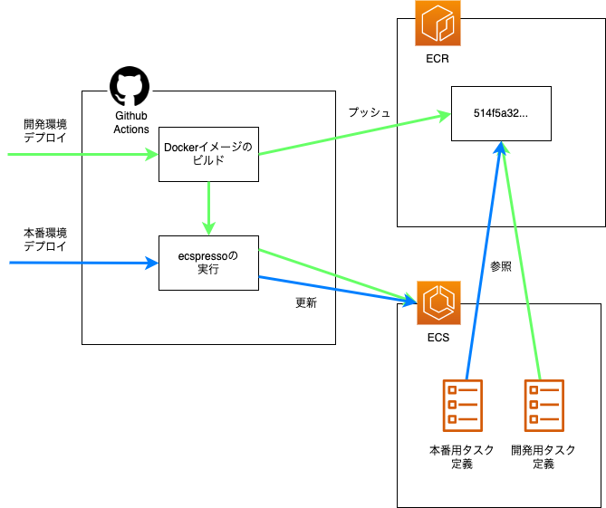 取得したコミットハッシュをイメージのタグ名として、イメージのビルド・ECR へのプッシュを行い、ecspresso でそのイメージを利用する形にすれば、開発環境で検証したイメージを本番環境デプロイ時に流用できる設計となりました。