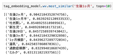 ここまででタグのベクトルが計算できたので、類似タグを見ながらモデルの良し悪しを定性的にチェックしてみます。