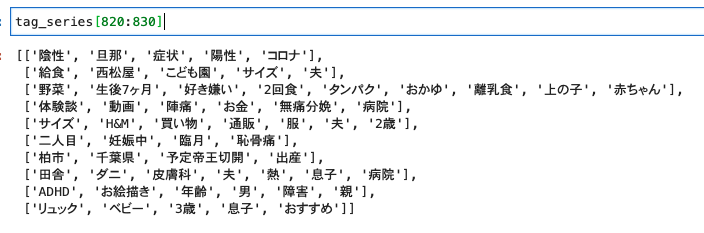 sequence_df = pd.DataFrame(df.groupby(['id'])['tag'].apply(list)).reset_index() sequence_df['tag_length'] = sequence_df['tag'].apply(lambda x: len(x)) # タグの数が3個未満のデータは除外する sequence_df = sequence_df[sequence_df['tag_length'] > 3].reset_index(drop=True) tag_series = sequence_df['tag'].tolist()